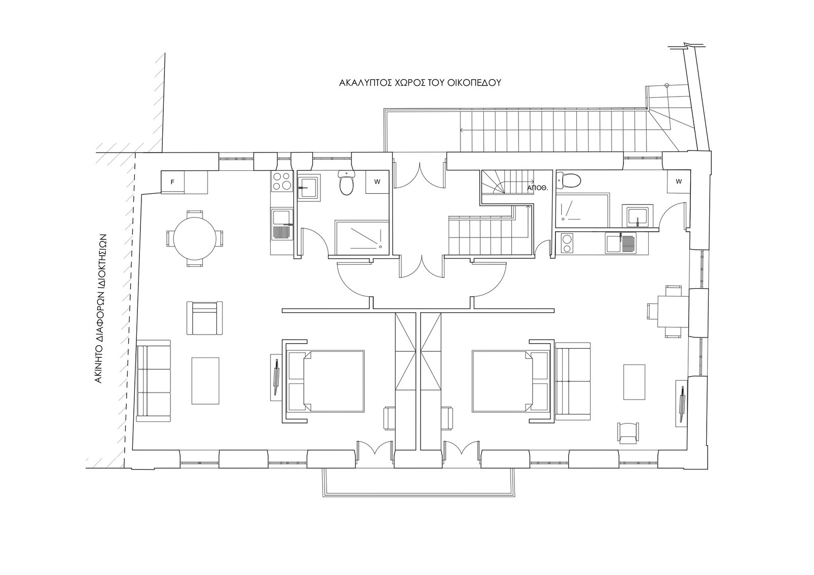 Διαμόρφωση διαμερίσματος ορόφου 122,50 τ.μ. διατηρητέου κτιρίου εντός πόλης της Κέρκυρας στη περιοχή της Γαρίτσας σε δυο αυτόνομα διαμερίσματα, έτσι ώστε να αυξηθεί η ωφέλιμη επιφάνειά τους, με γνώμονα την καλαισθησία και τη λειτουργικότητα των χώρων. Πραγματοποίηση επισκευής εξωτερικών όψεων συνδυάζοντας τις αξίες διατήρησής τους, με νέες τεχνικές και μεθόδους που θα αντέχουν στο χρόνο.