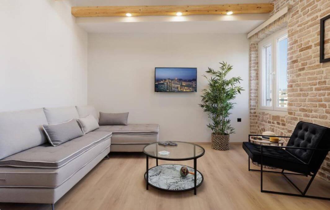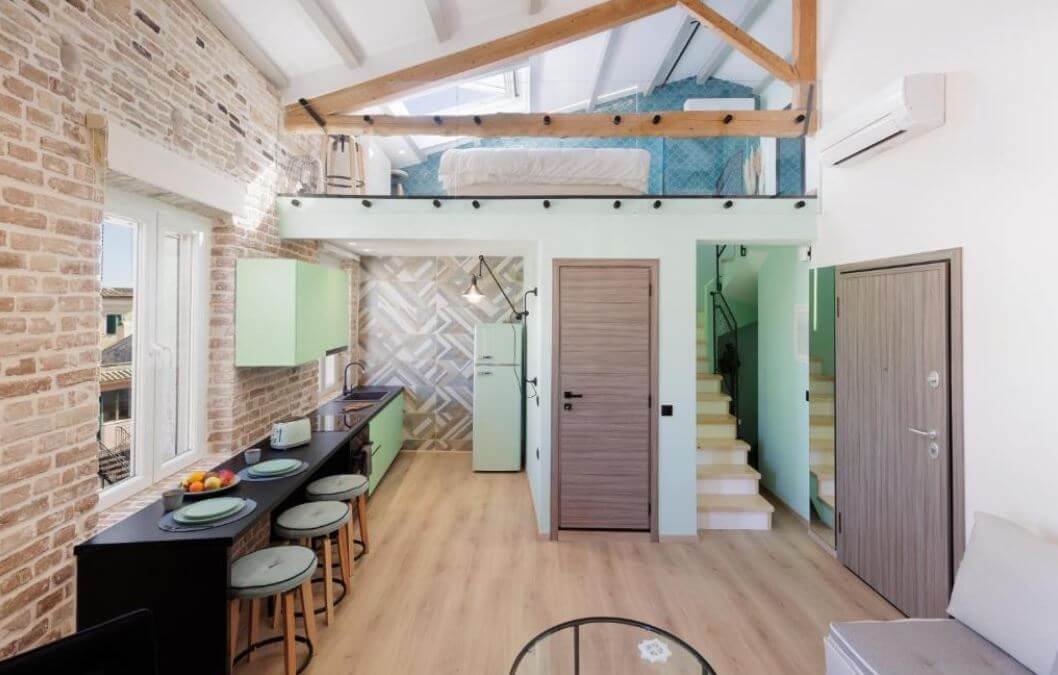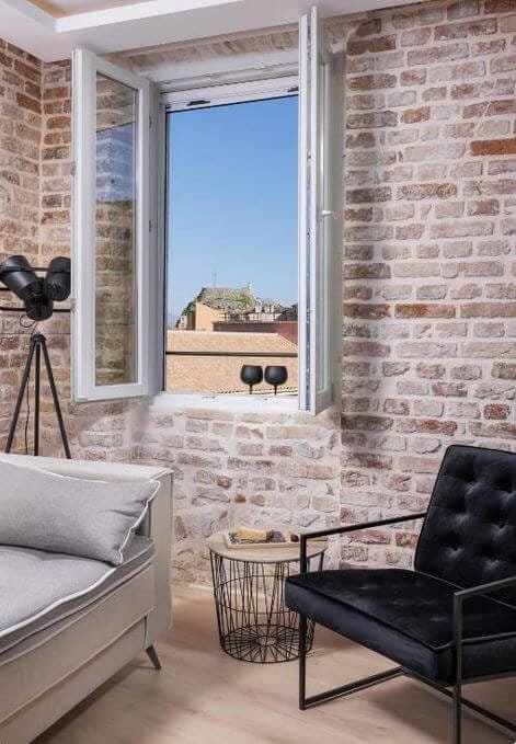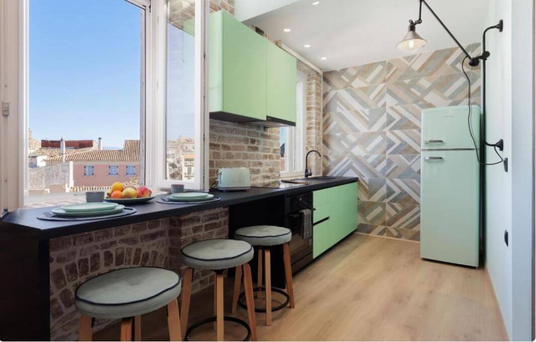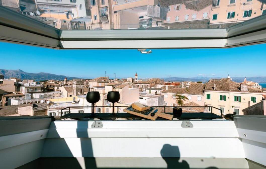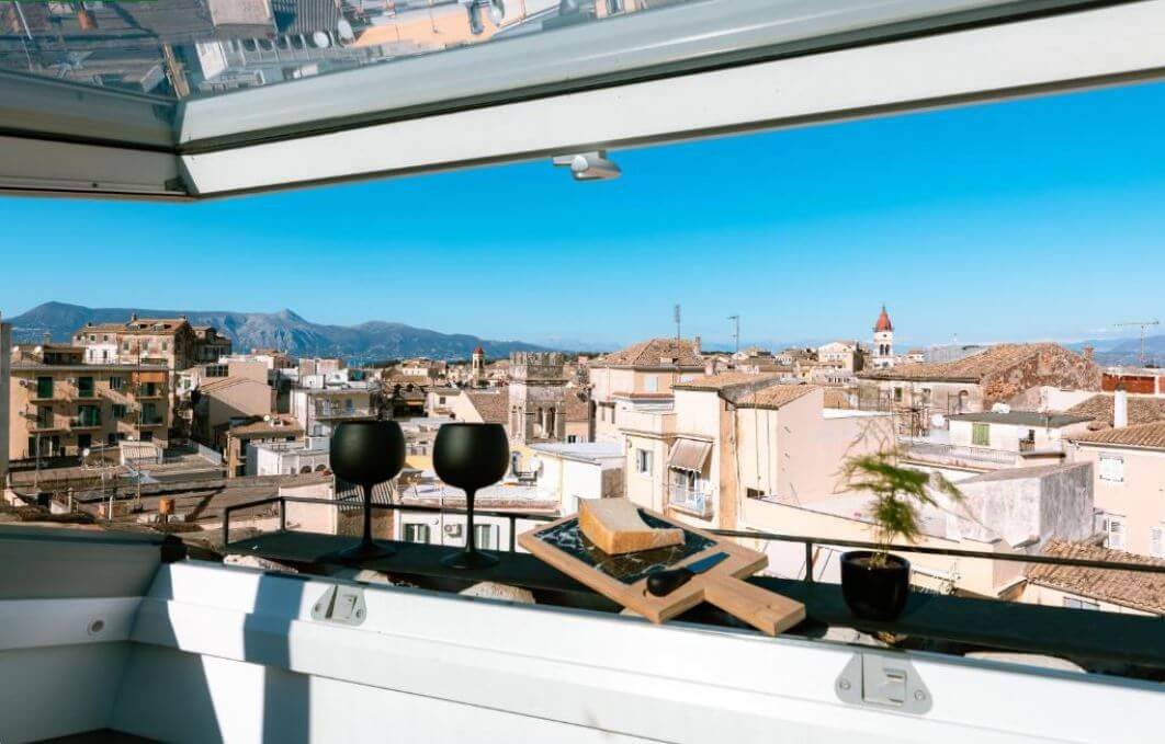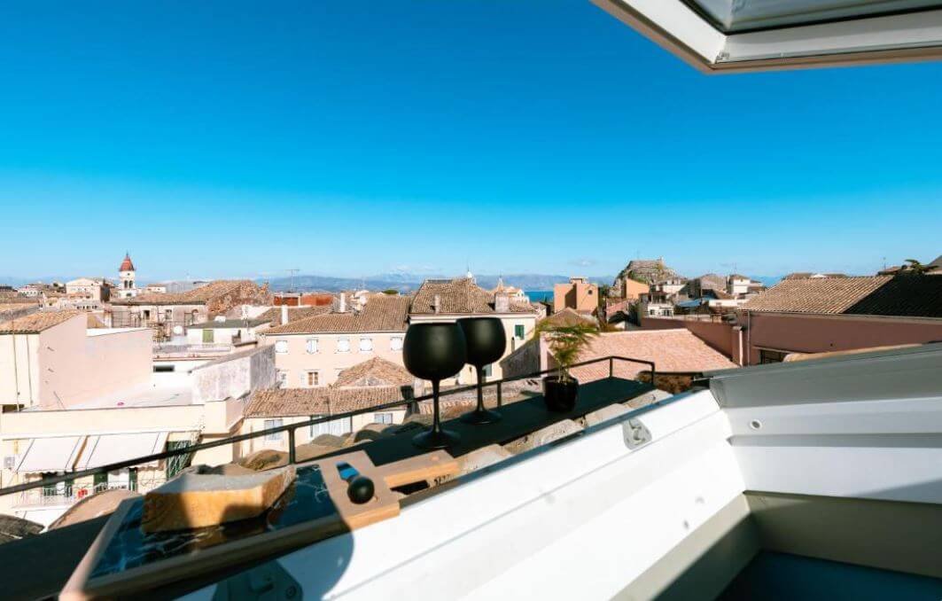 Σε πενταώροφο κτίριο που βρίσκεται στη παλαιά πόλη της Κέρκυρας και συγκεκριμένα στο διαμέρισμα του πέμπτου ορόφου το οποίο έχει εξαιρετική θέα, πραγματοποιήθηκε τμηματική επισκευή στέγης και στοχευμένες εσωτερικές διαρρυθμίσεις, ώστε να επιτευχθεί η εύρυθμη λειτουργία και η μέγιστη δυνατή βελτίωση του χώρου. Συγκεκριμένα η προτεινόμενη λύση δημιούργησε ωφέλιμο χώρο για δύο ανεξάρτητα διαμερίσματα που έχουν χρήση τουριστική.