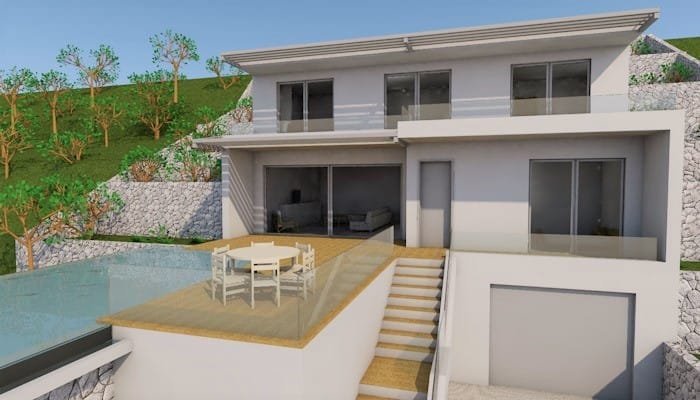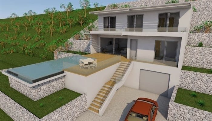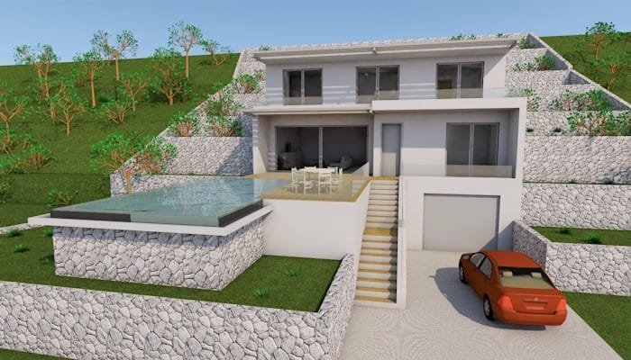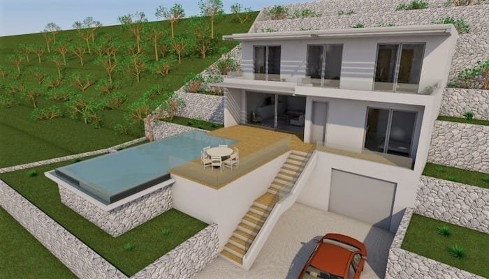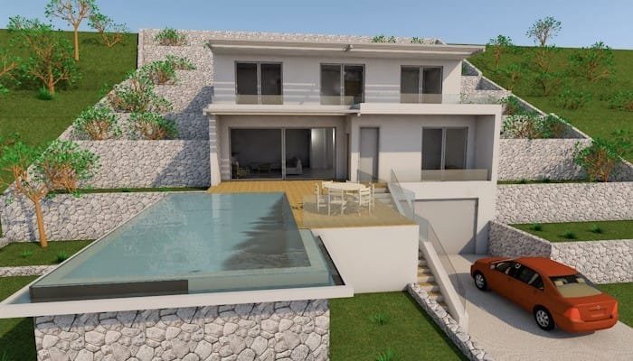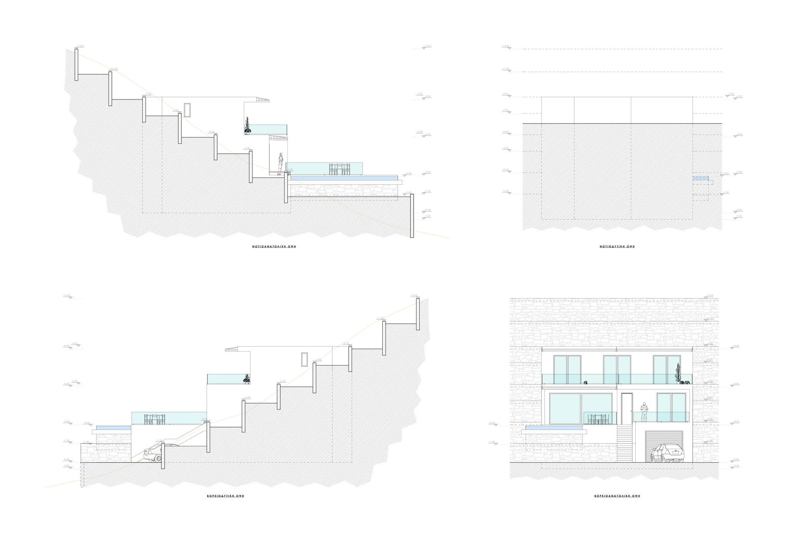 Σε ιδιαίτερα επικλινές οικόπεδο στη περιοχή Αγνί της Κέρκυρας εκπονήθηκε αρχιτεκτονική μελέτη για τη δημιουργία διώροφης κατοικίας με πισίνα. Εντοπίζεται πλησίον της θάλασσας έχοντας πλούσια βλάστηση, ενώ η προτεινομένη λύση αναπτύσσεται κλιμακωτά λόγο του ανάγλυφου του εδάφους που είναι απότομο. Έγινε ιδιαίτερη προσπάθεια για την ομοιόμορφη ένταξη του όγκου έτσι ώστε να εκμεταλλεύεται στο έπακρον τους συντελεστές δόμησης με ικανό υπαίθριο χώρο και πισίνα, σε ένα σύνθετο οικόπεδο.
